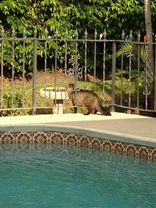The wild cat, who kinda calls our back yard his home base, slunk up to the birdbath ever so cautiously. He had one foot through the fence, then got the other through. There he was, straddling the fence so to speak.
